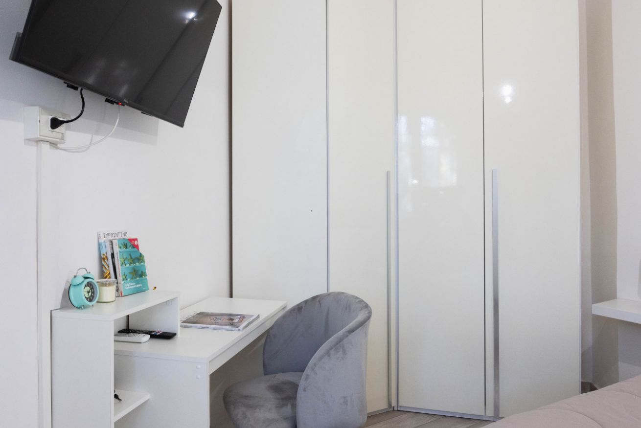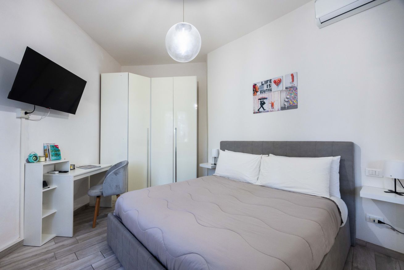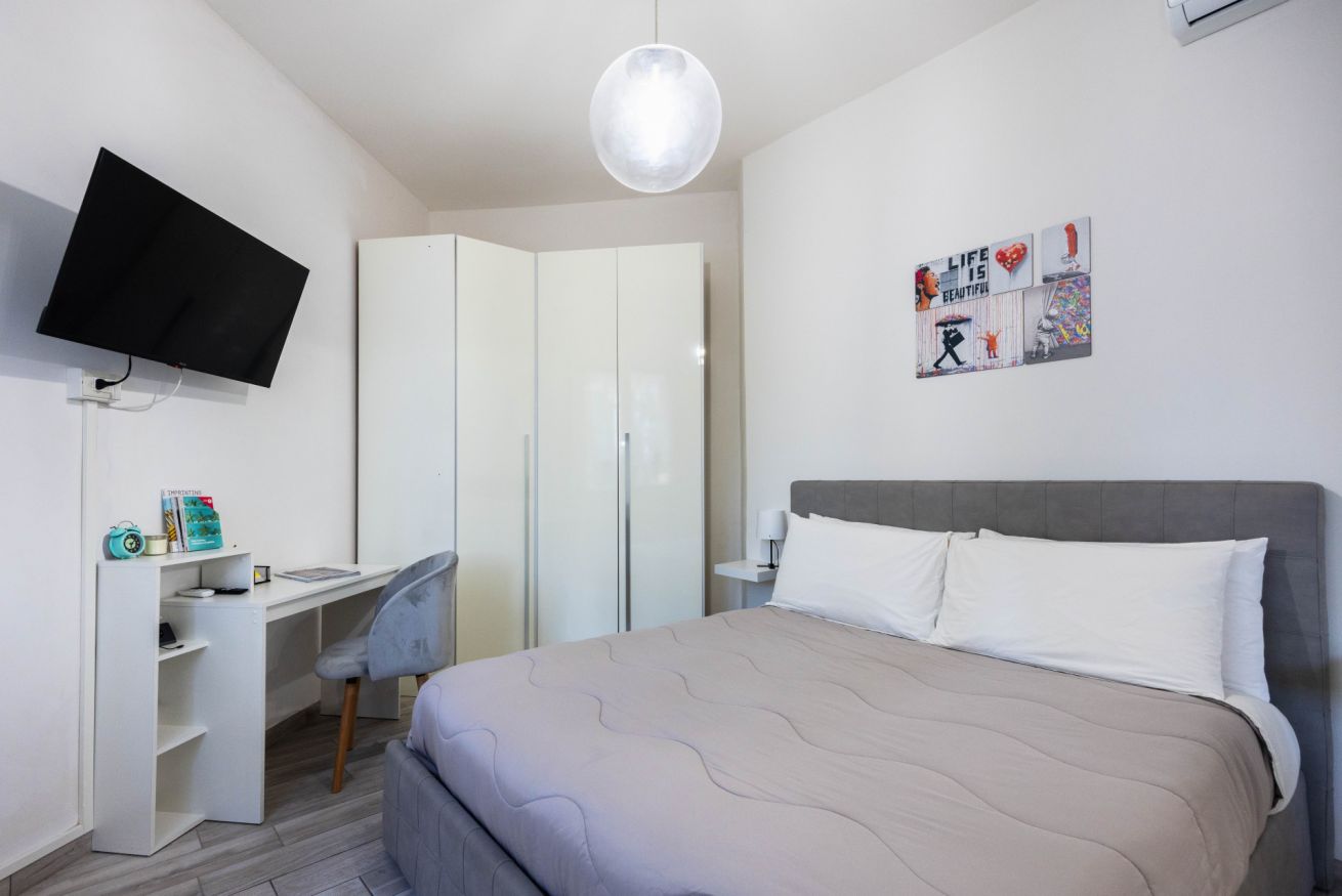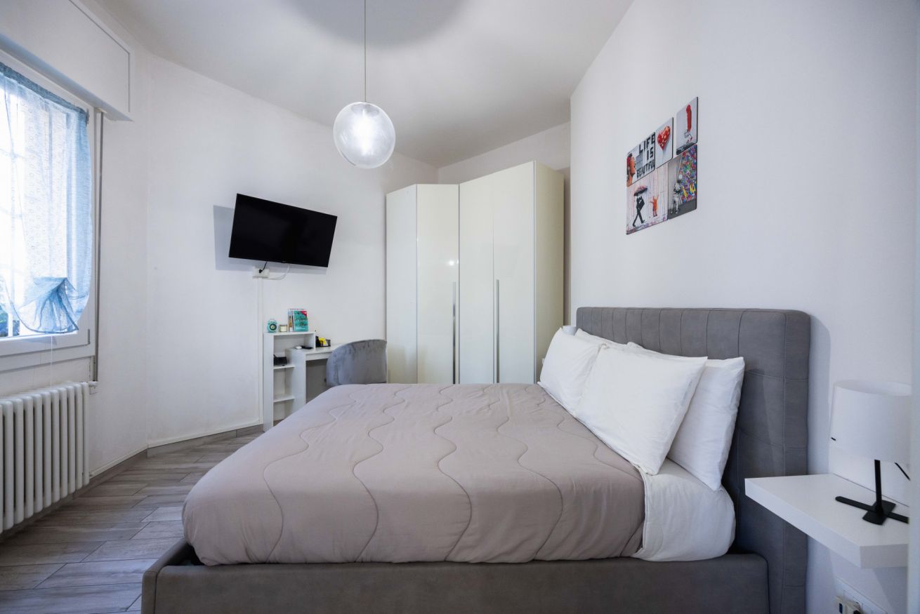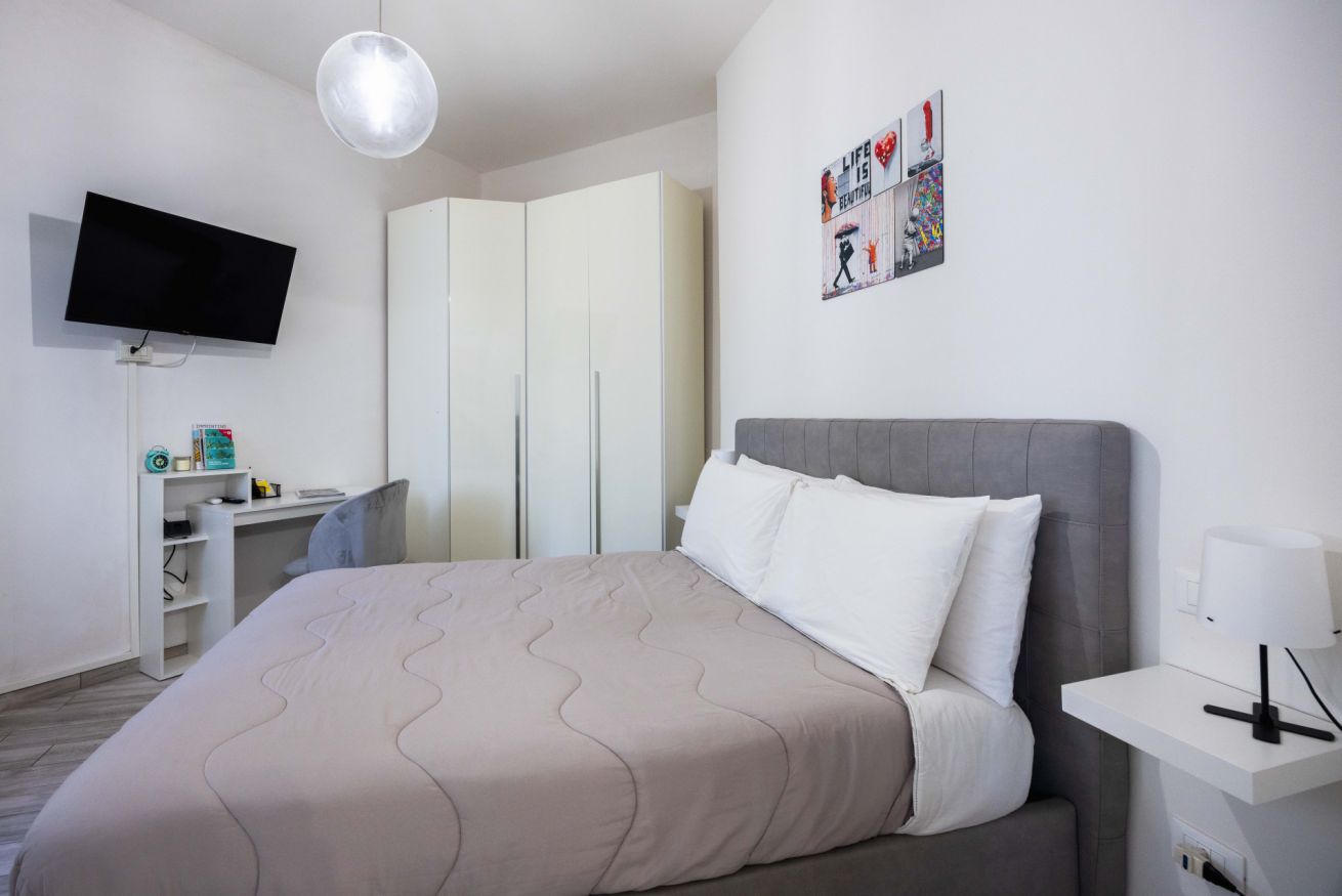 La camera da letto è spaziosa e arredata con gusto, dotata di un grande letto matrimoniale, TV a schermo piatto e armadio capiente. La luminosità naturale e i colori caldi rendono lo spazio perfetto per riposare dopo una giornata in città. È presente anche una pratica postazione con sedia, ideale per chi necessita di lavorare da remoto.
