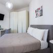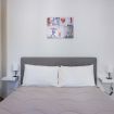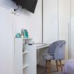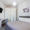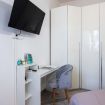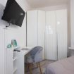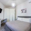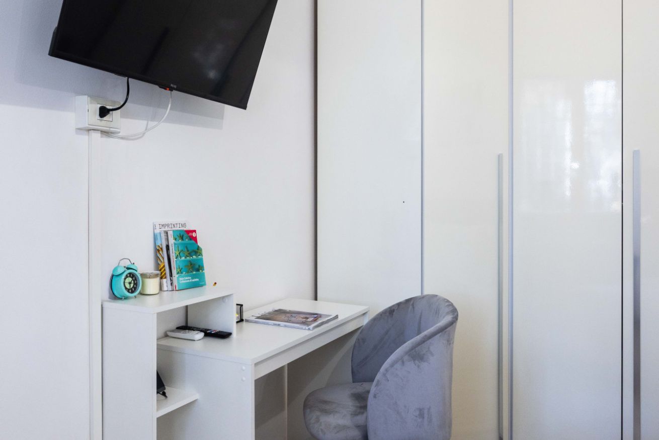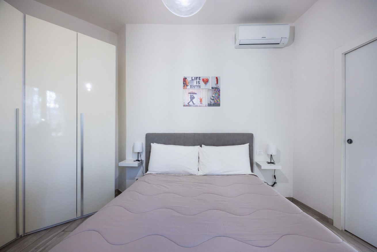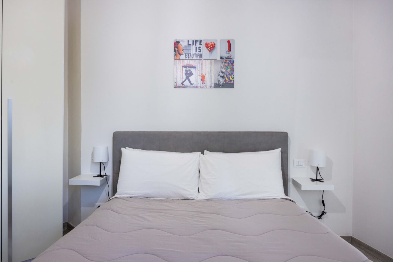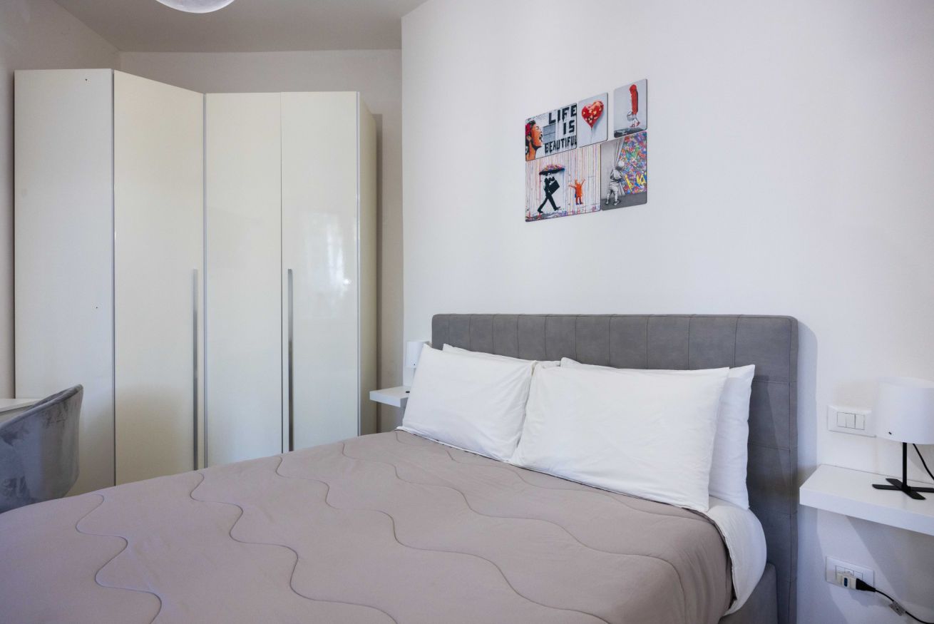 La camera da letto è spaziosa e arredata con gusto, dotata di un grande letto matrimoniale, TV a schermo piatto e armadio capiente. La luminosità naturale e i colori caldi rendono lo spazio perfetto per riposare dopo una giornata in città. È presente anche una pratica postazione con sedia, ideale per chi necessita di lavorare da remoto.