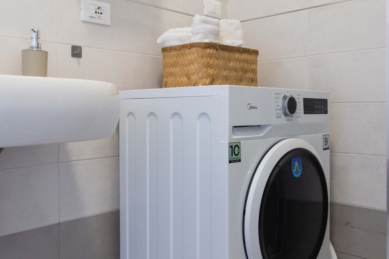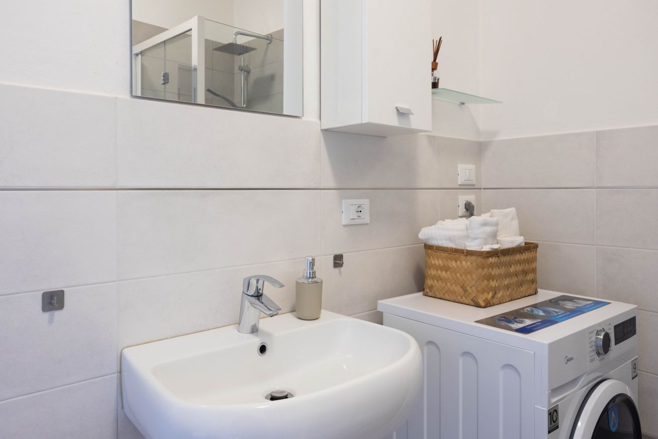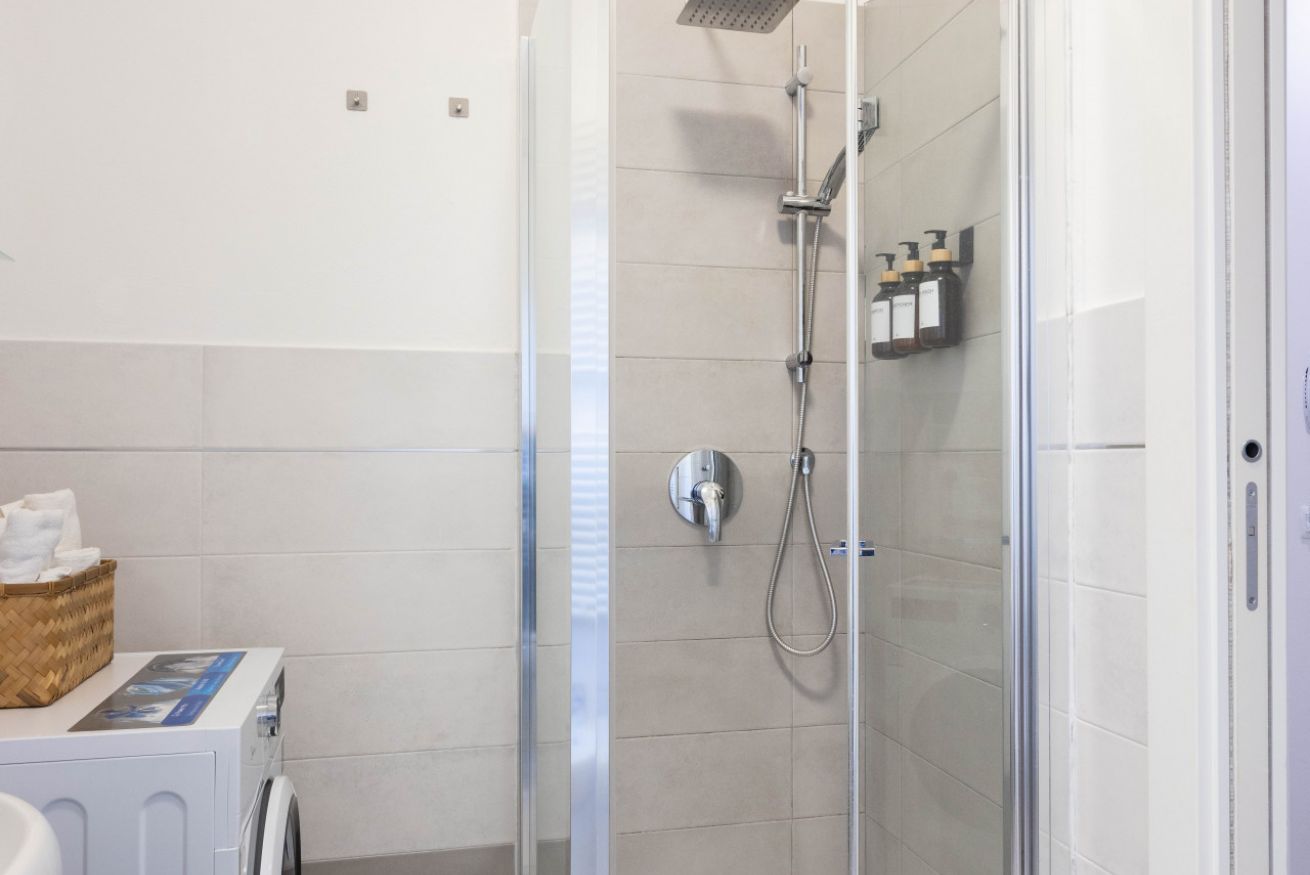 Il bagno moderno offre una doccia ampia, lavatrice e tutto ciò che occorre per un soggiorno confortevole. Gli interni sono puliti, essenziali e progettati per garantire un’esperienza piacevole e senza pensieri.