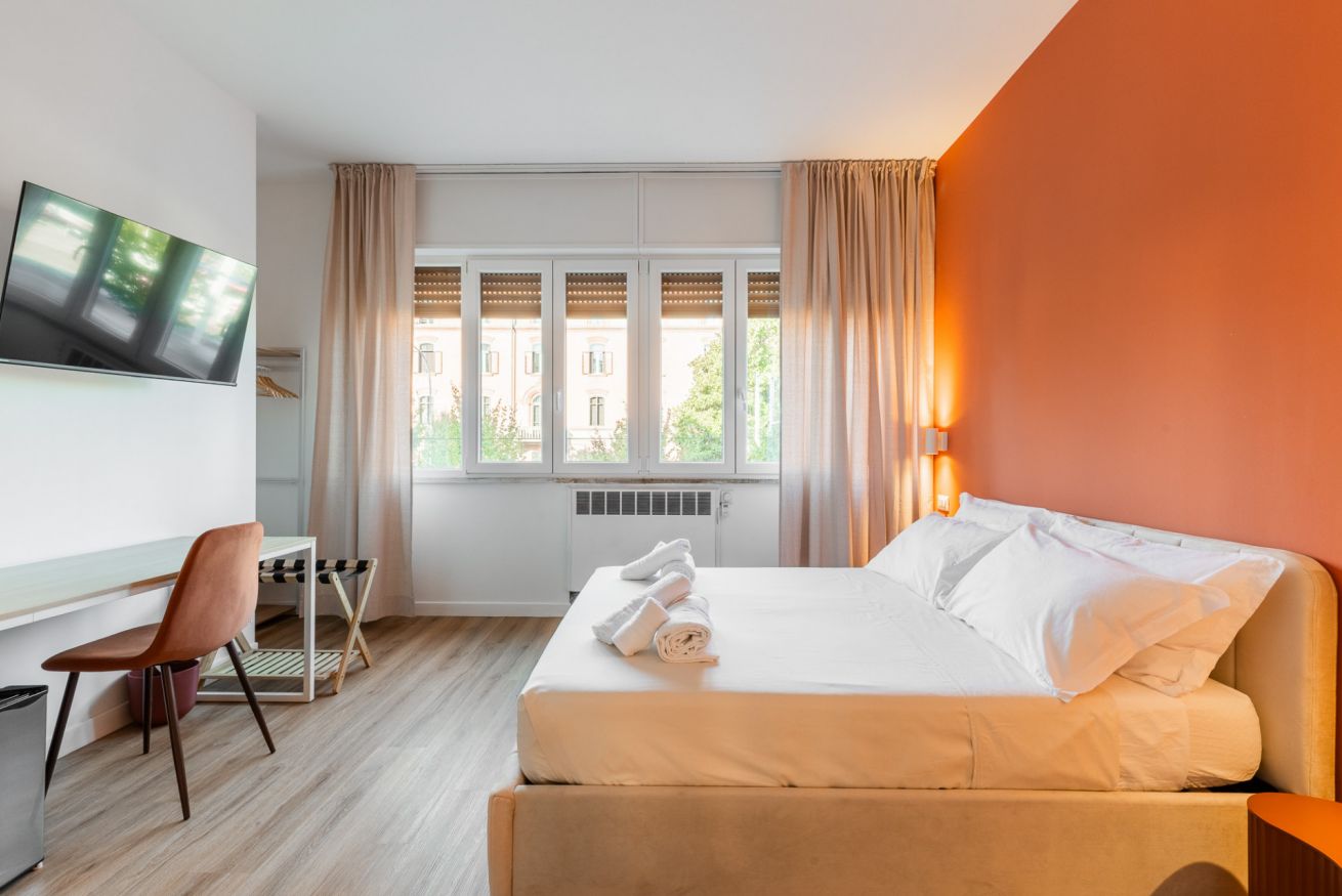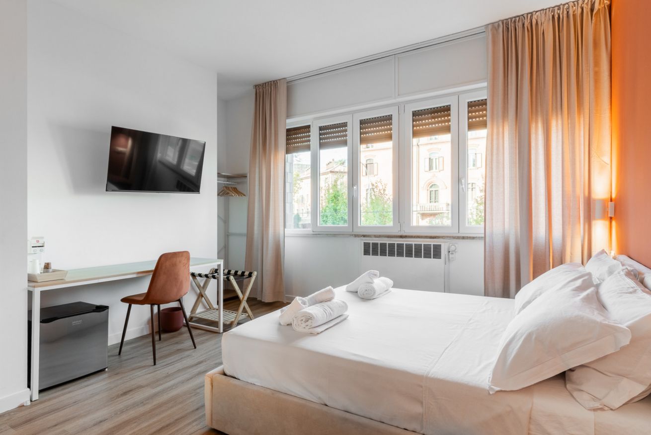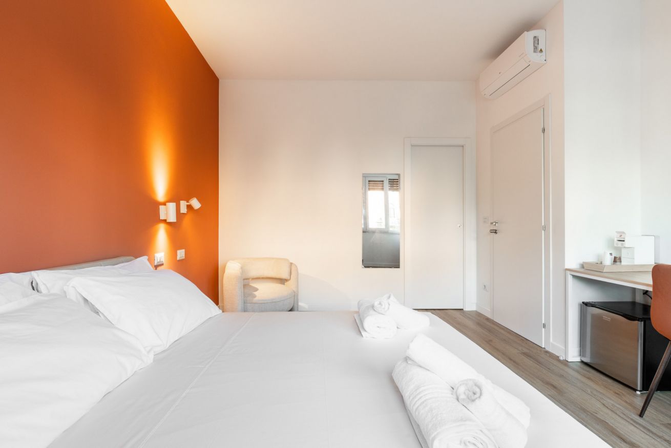 Un’oasi di comfort e stile: la nostra Camera 1, con i suoi quasi 22 m², regala spazi ampi e raffinati, impreziositi da arredi eleganti e dettagli di design. L’accesso esclusivo al bagno privato, moderno e luminoso, completa l’esperienza con doccia spaziosa e finiture di pregio, offrendo a chi prenota un ambiente unico, curato e accogliente per un soggiorno indimenticabile.