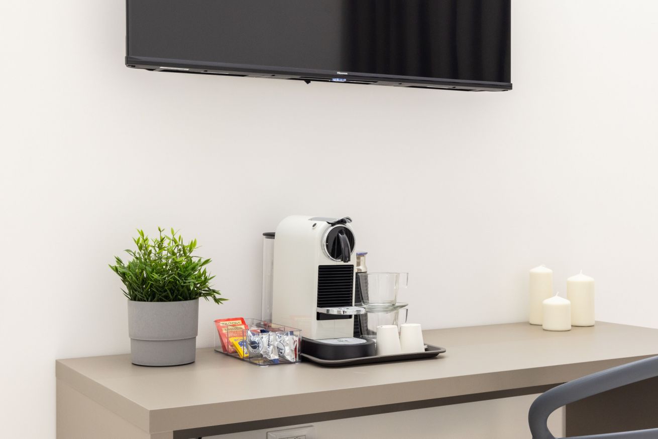 Per un momento di relax, troverai a tua disposizione una macchina del caffè con cialde e un bollitore con una selezione di tè e tisane.